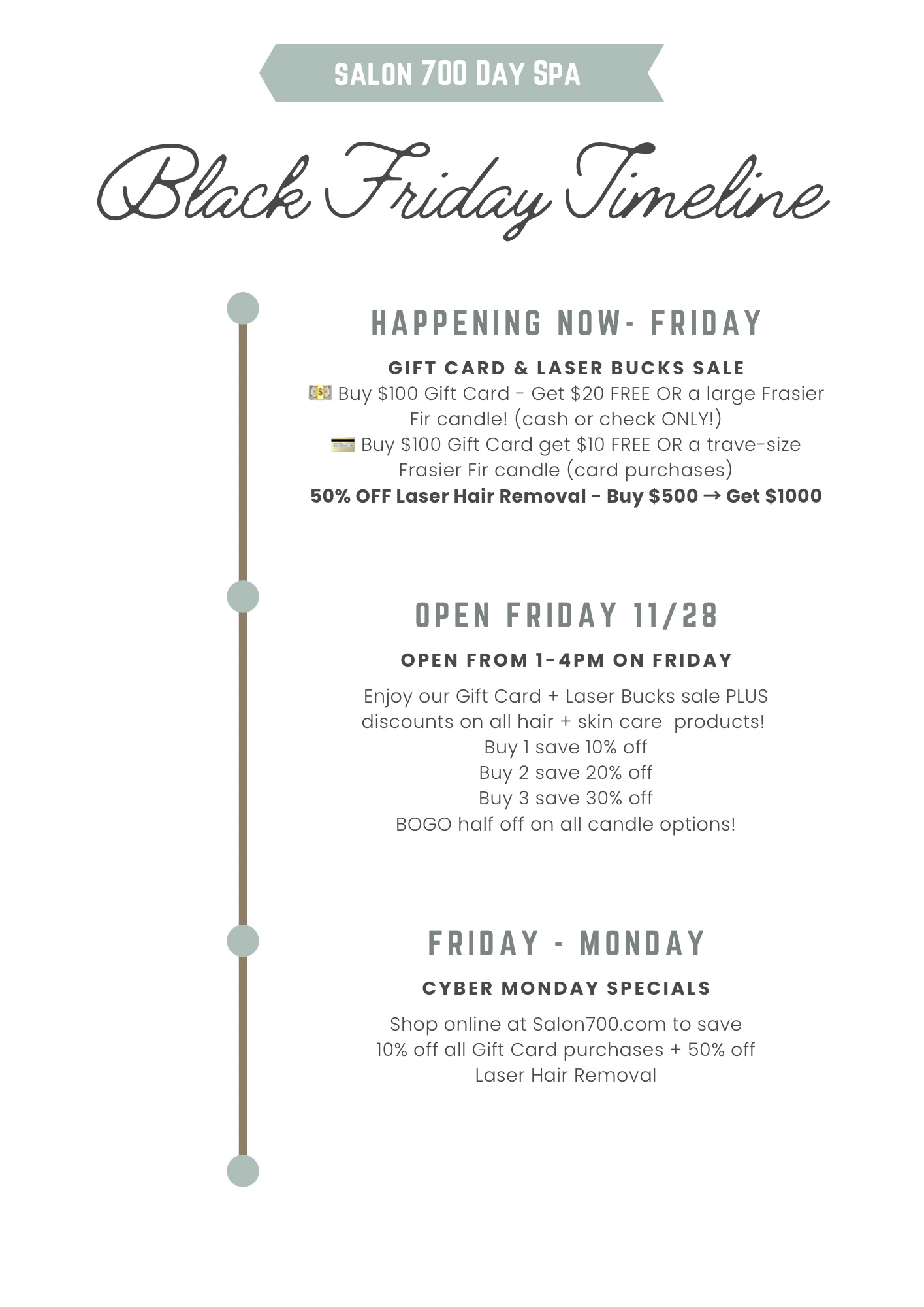 Order BLACK FRIDAY Laser Hair Removal HEREWelcome to Salon 700 & Day Spa, where luxury meets intention... Step into your personal retreat where our team of passionate professionals deliver industry-leading treatments and Hair artistry in an atmosphere of calm elegance and care. From the moment you arrive you're not just a guest - you're part of something special.
